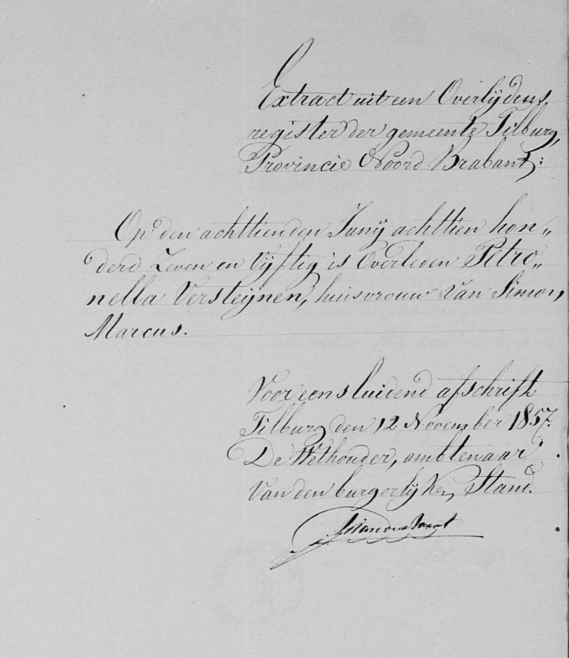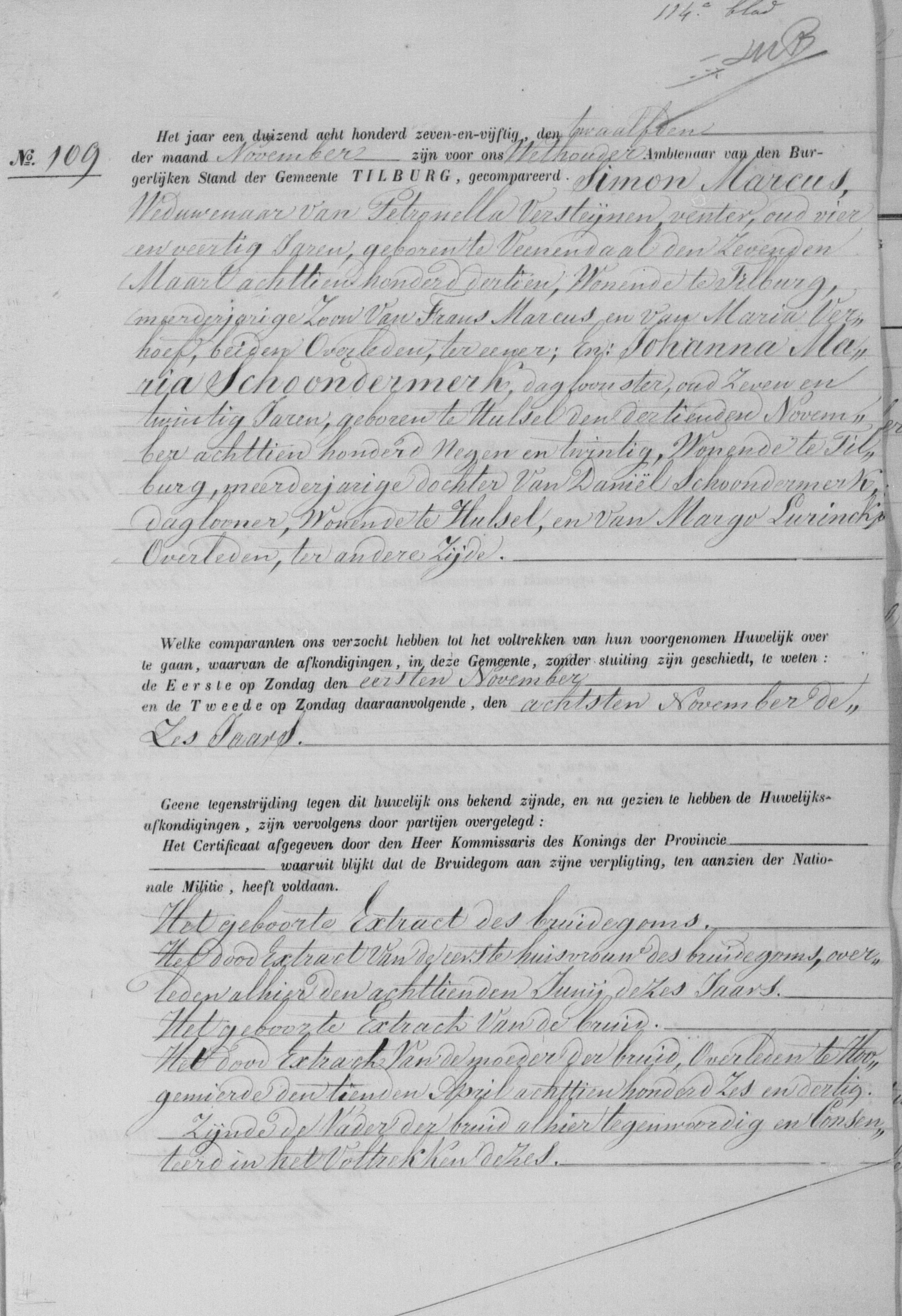 | Johanna is geboren op 13 november 1829 te Hulsel. Zij is gestorven op 2 juni 1909 te Noord Eschmarke (Lonneker). Haar vader is Daniël Schoondermerk ♥ en haar moeder is Margo Lurinck ♥ . Johanna Schoondermerk is getrouwd met Simon Marcus ♥ op 12 november 1857 te Tilburg. Informatie: Ook: Schoonderbeek (bron23) Ook: Schoondermark (bron23) Johanna Maria Schoondermarc (in 1945, bron 23) Ze woonde in Hulsel (Reusel-de Mierden) in Noord Brabant (bron 23). Geboorte-acte 1829: huwelijksakte-Simon-Marcus-en-Johanna-Maria-Schoondermerk-Tilburg-1857-deel-1 ![]() open in apart venster huwelijksakte-Simon-Marcus-en-Johanna-Maria-Schoondermerk-Tilburg-1857-deel-2 ![]() open in apart venster huwelijksbijlage-Simon-Marcus-en-Johanna-Maria-Schoondermerk-Tilburg-deel-1-1857 ![]() open in apart venster huwelijksbijlage-Simon-Marcus-en-Johanna-Maria-Schoondermerk-Tilburg-deel-2-1857 ![]() open in apart venster huwelijksbijlage-Simon-Marcus-en-Johanna-Maria-Schoondermerk-Tilburg-deel-3-1857 ![]() open in apart venster huwelijksbijlage-Simon-Marcus-en-Johanna-Maria-Schoondermerk-Tilburg-deel-4-1857 ![]() open in apart venster Zie ook discussie: http://www.stamboomforum.nl/familienamen/2/40579/0 |